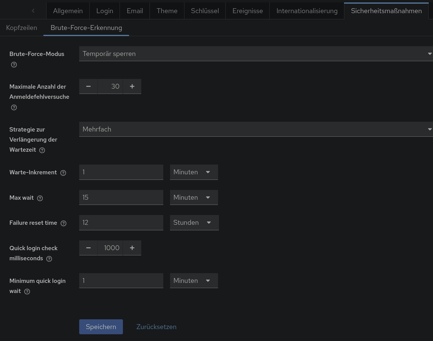 By using the default settings, Keycloak provides basic protection against brute-force login attempts without additional manual tuning. You can customize these values later based on your security requirements.