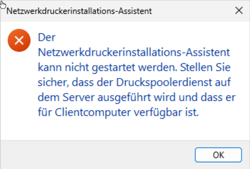“Der Netzwerkdruckerinstallations-Assistent kann nicht gestartet werden. Stellen Sie sicher, dass der Drucketspoolerdienst auf dem Server ausgeführt wird und dass er für Clientcomputer verfügbar ist.”