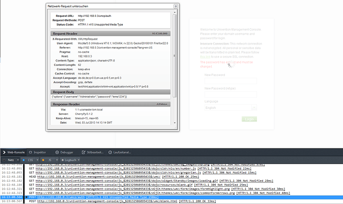 Was mir noch aufgefallen ist, wenn der Screen beim vor dem Passwort ändern ewig läd, meldet der Browser “Unsupported Media Type”: